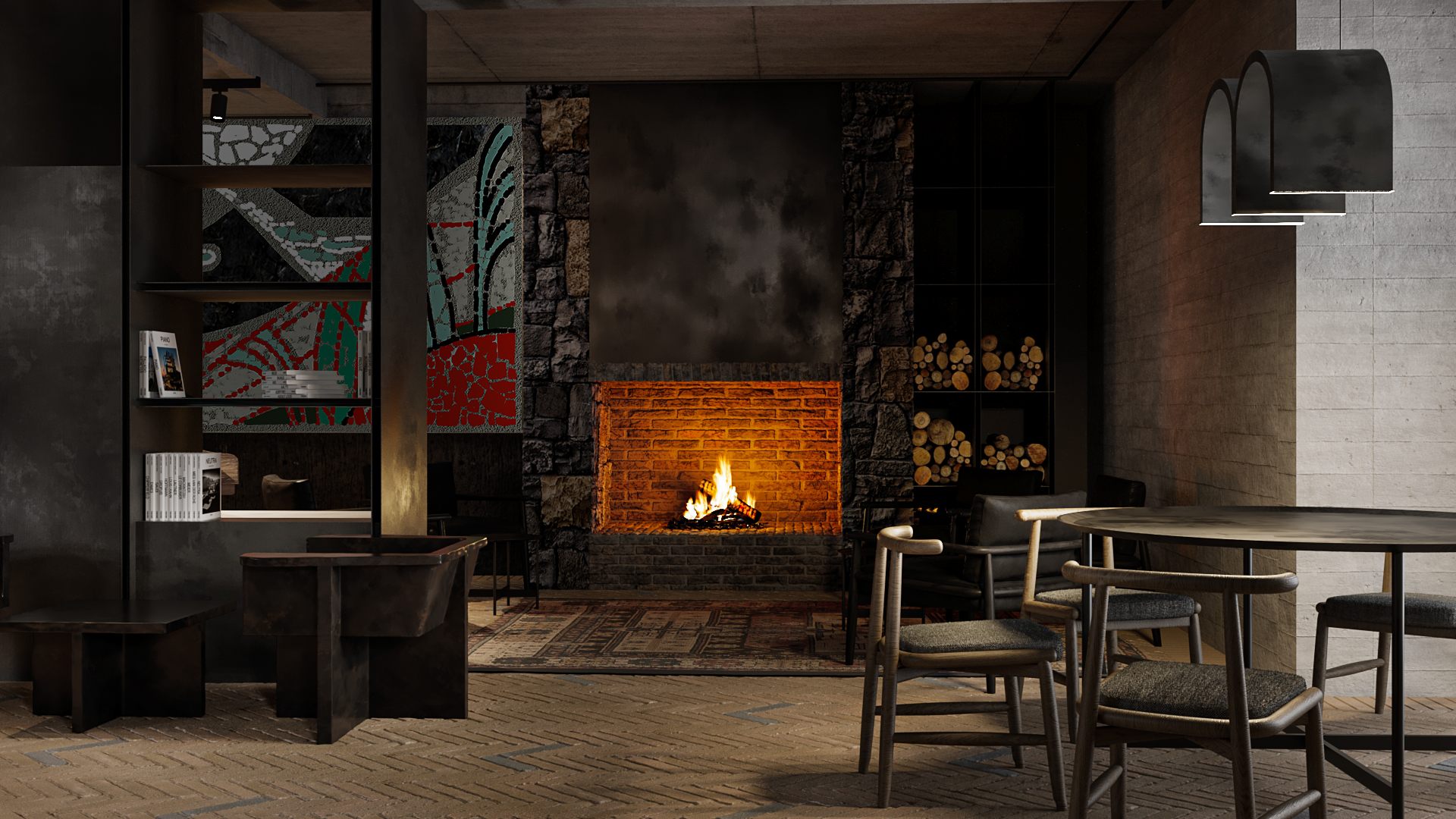 dilijan is known for using wood and terracotta bricks largely in vernacular architecture, which was combined here with modern sculptural shapes and materials. the lighting is dimmed and quite dark in order to transfer the initial idea and create calming atmosphere of enjoying mountainous views and forests in the area.